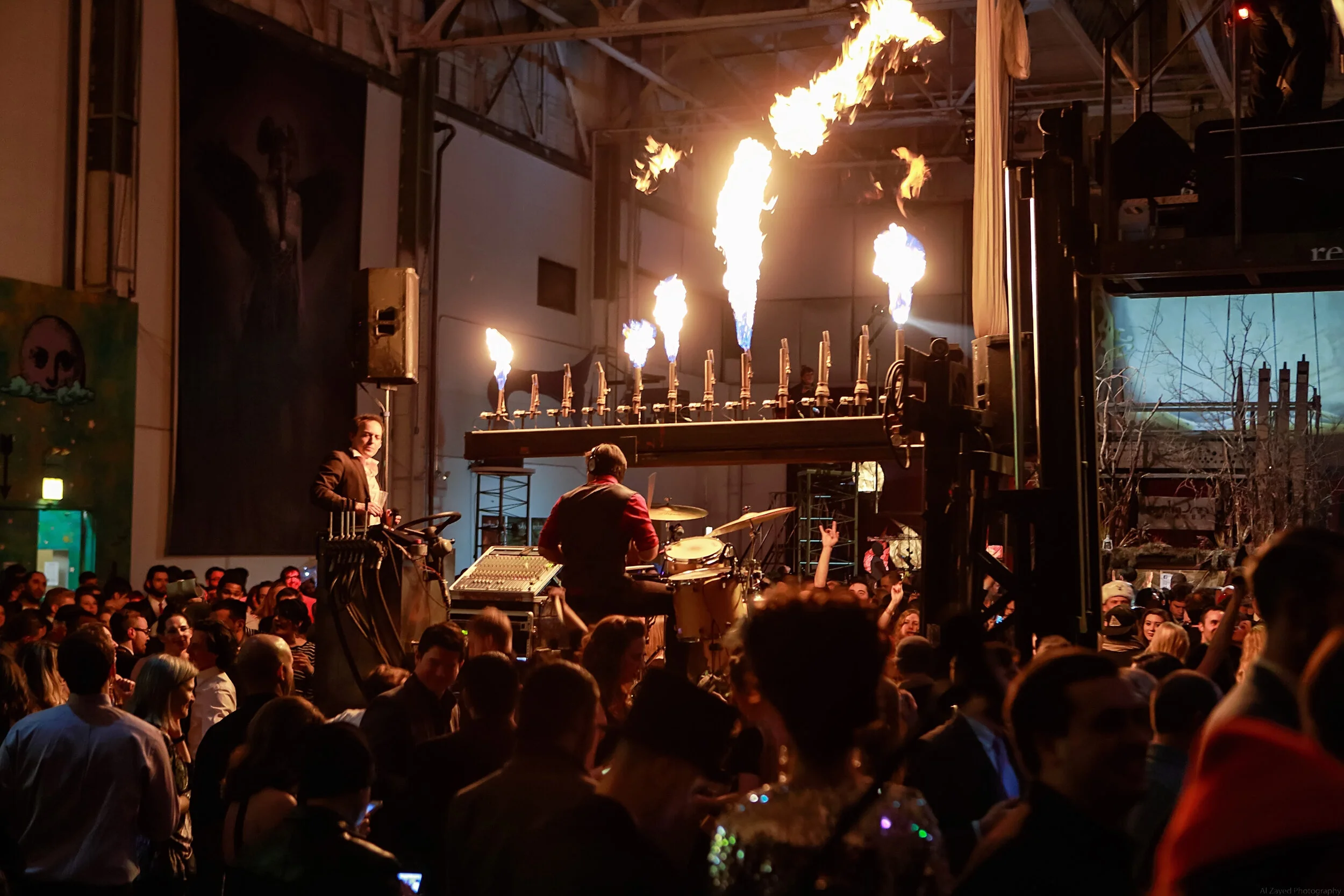 A custom double fork lift rolls into place, raising a 12-pipe Fire Organ up to 23 feet in the air, emitting glorious bursts of flame all synchronized to a musical interface and New Moon’s very own Mobile DJ Unit!