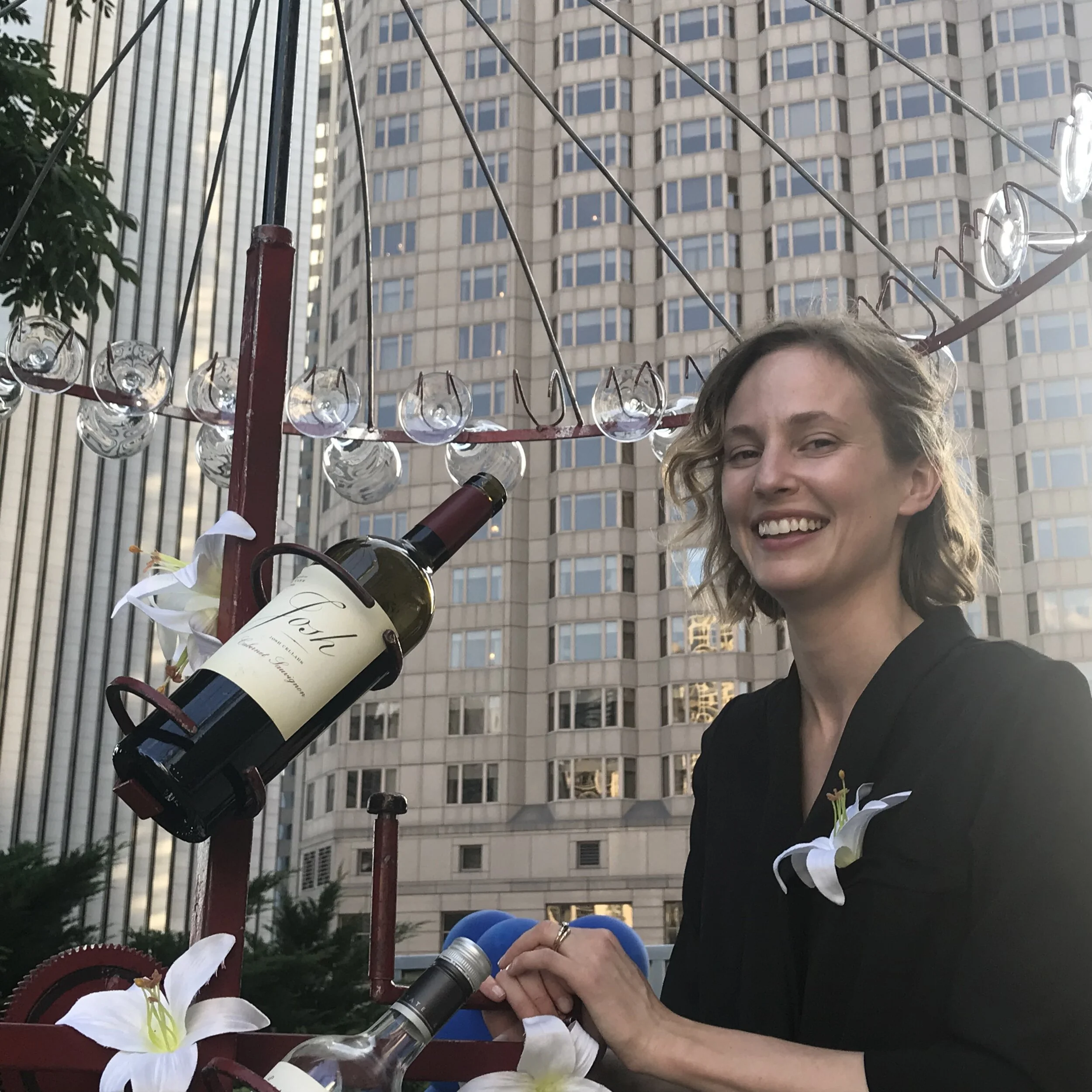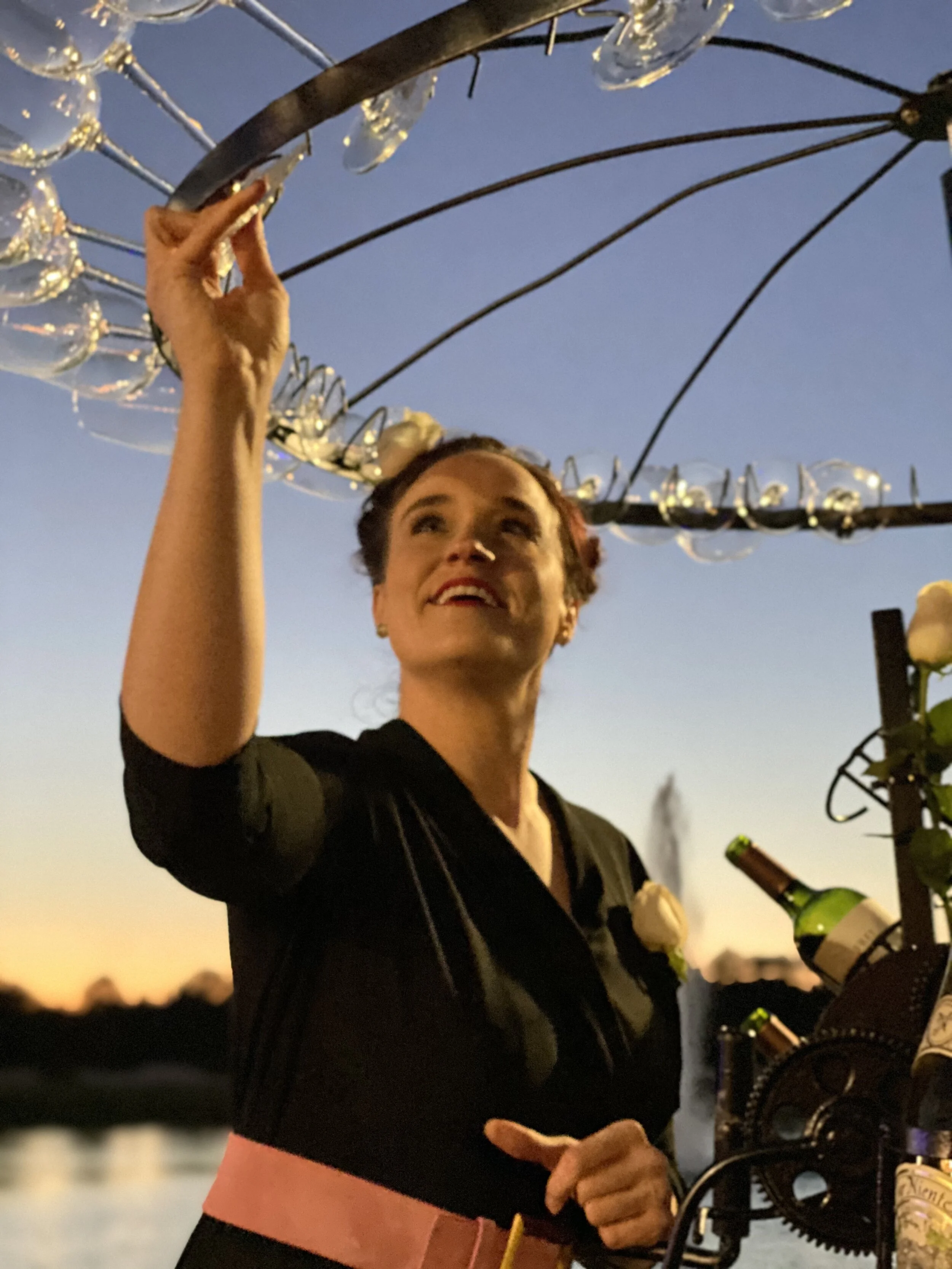 A canopy of stemmed glassware spins above the head of a rider, who works with exquisite precision as a series of mechanical interactions pour wine into an waiting glass.